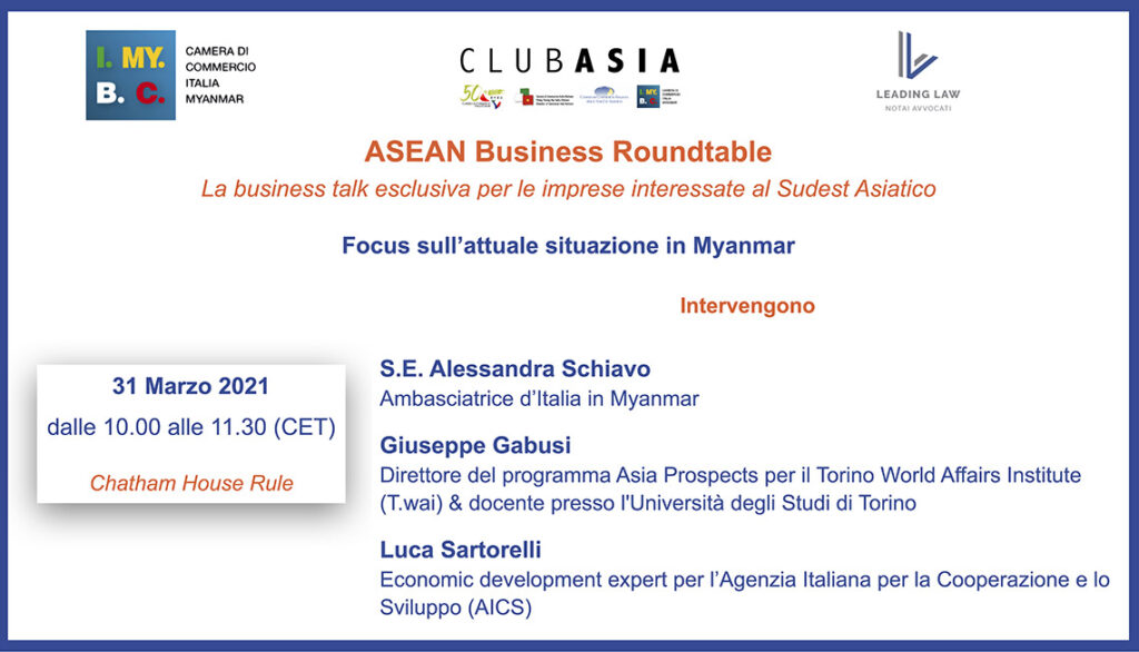 For the ASEAN Business Roundtable meetings, on March 31 we organised the roundtable to analyse the present situation in Myanmar with H.E. Alessandra Schiavo, Ambassador of Italy in Myanmar, Professor Giuseppe Gabusi and Mr. Luca Sartorelli.